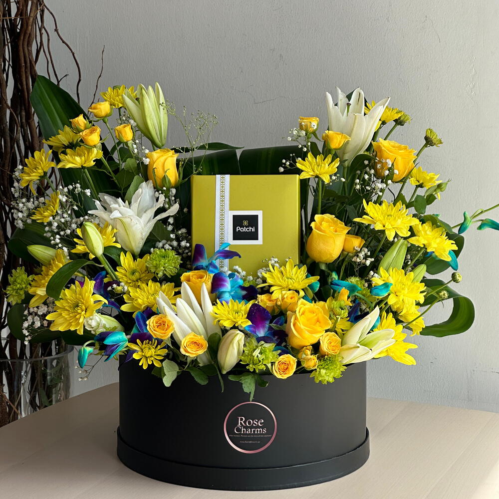 Yellow rose - 15 pcs black box - 1 pcs white lilly - 3 pcs blue orchid - 2 pcs green button chrysanthemum - 5 pcs greeneries - 5 pcs patchi chocolate (500 gram) - 1 pcs yellow chresanthemum - 4 pcs