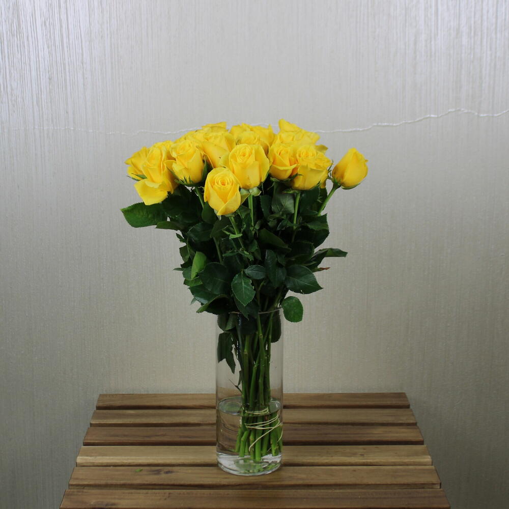 A cheerful arrangement of yellow roses beautifully displayed in an elegant vase, radiating warmth and joy. The vibrant yellow blooms, symbolizing friendship, happiness, and new beginnings, create a bright and uplifting display. Perfect for any occasion, this arrangement exudes charm and positivity. Whether as a thoughtful gift, a centerpiece, or a way to brighten someones day, these stunning yellow roses bring a touch of natural beauty to any space.