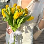 Bouquet of 15 yellow tulips only with ribbon, without wrapping.