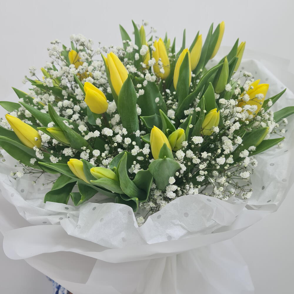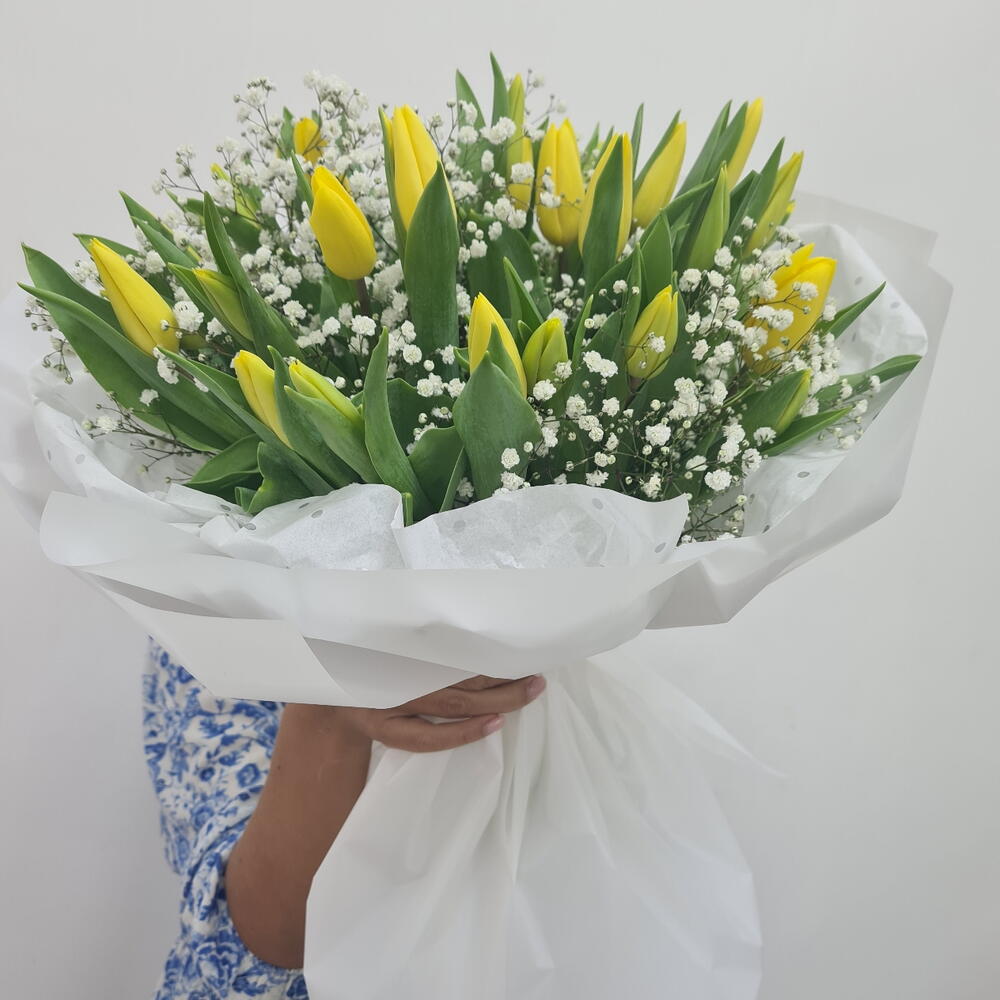 Gypsophila - 10 pcs wrapping paper - 8 pcs yellow tulips - 30 pcs