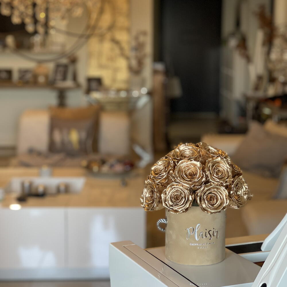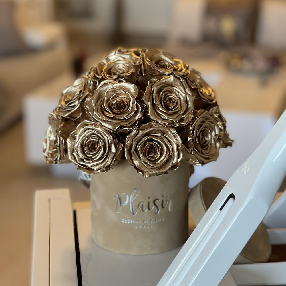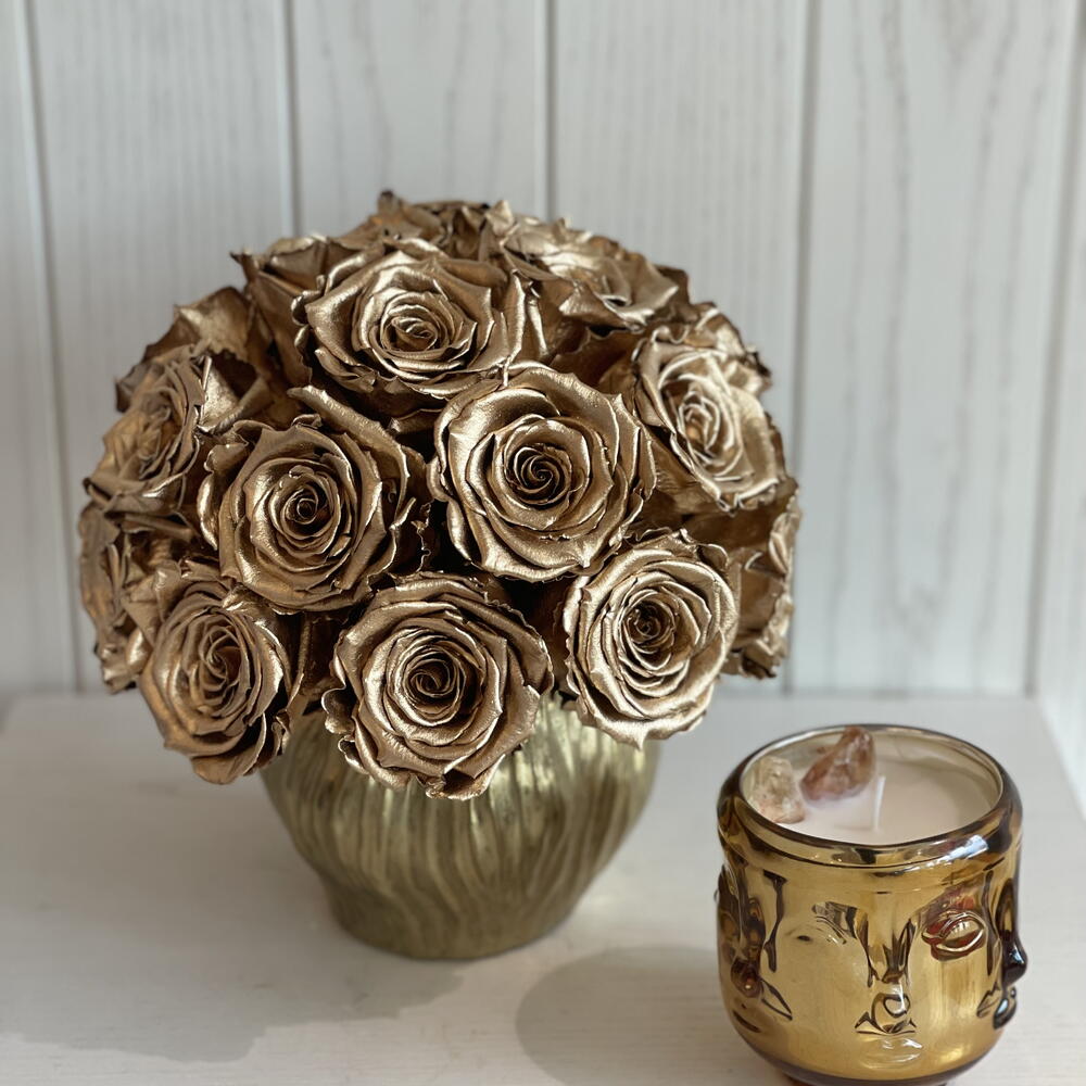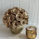 Forever Rose...A crown jewel at Plaisir, our unique Gold infinity preserved roses are a stunning gift that is sure to wow your receiver. Lasting more than TWO years, this luxurious arrangement is the perfect way to show how much you care. Team it up with our unique candles topped up with a healing crystal for truly unforgettable gift. The candle is Gardenia scent. It is a beautiful and thoughtful gift emphasizing peace and tranquility.