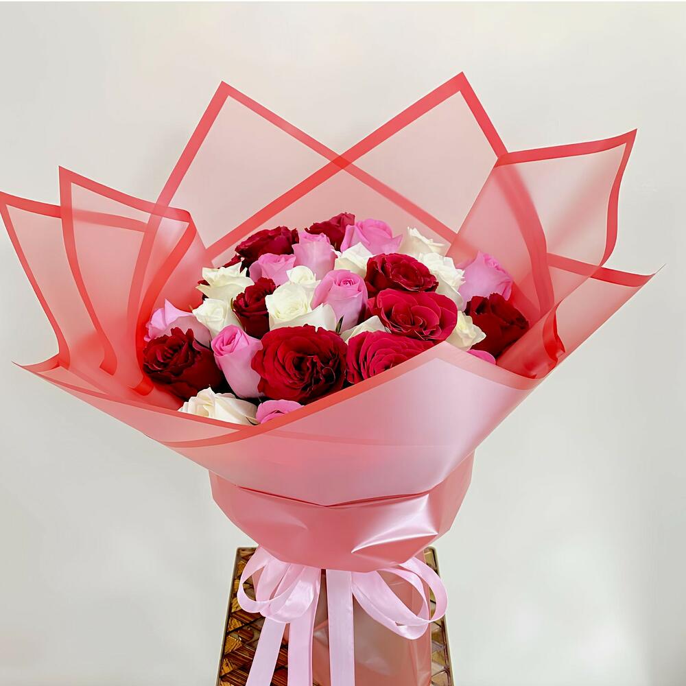 Presenting an elegant collection for floral gifting - a Florists Special blend of artfully arranged, vibrant Red rods, exquisite Pink Roses, and delicate White Roses. This bouquet, comprising of 10 Red rods, 9 Pink Roses, and 10 White Roses, is a testament to classical aesthetics and timeless taste. Perfect for every occasion, this floral ensemble is sure to add a touch of elegance and sophistication. Amplify the beauty of your special moments with this bespoke flower arrangement.