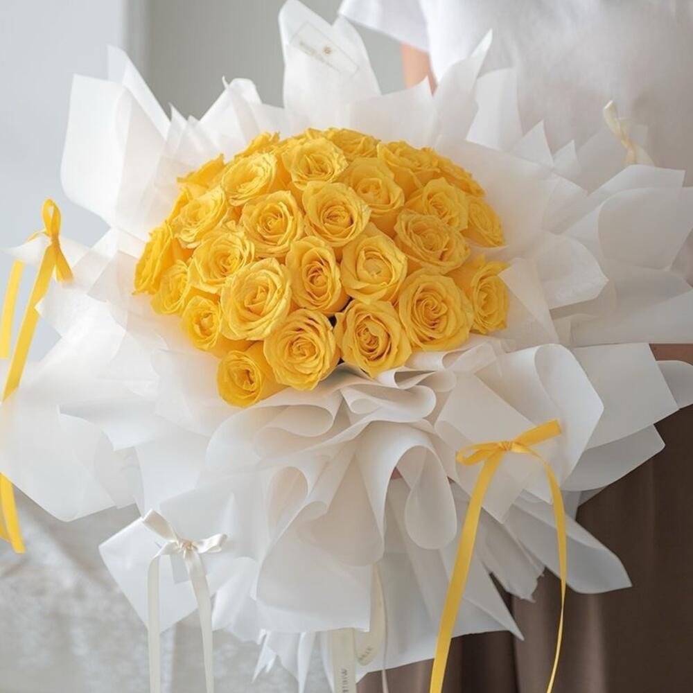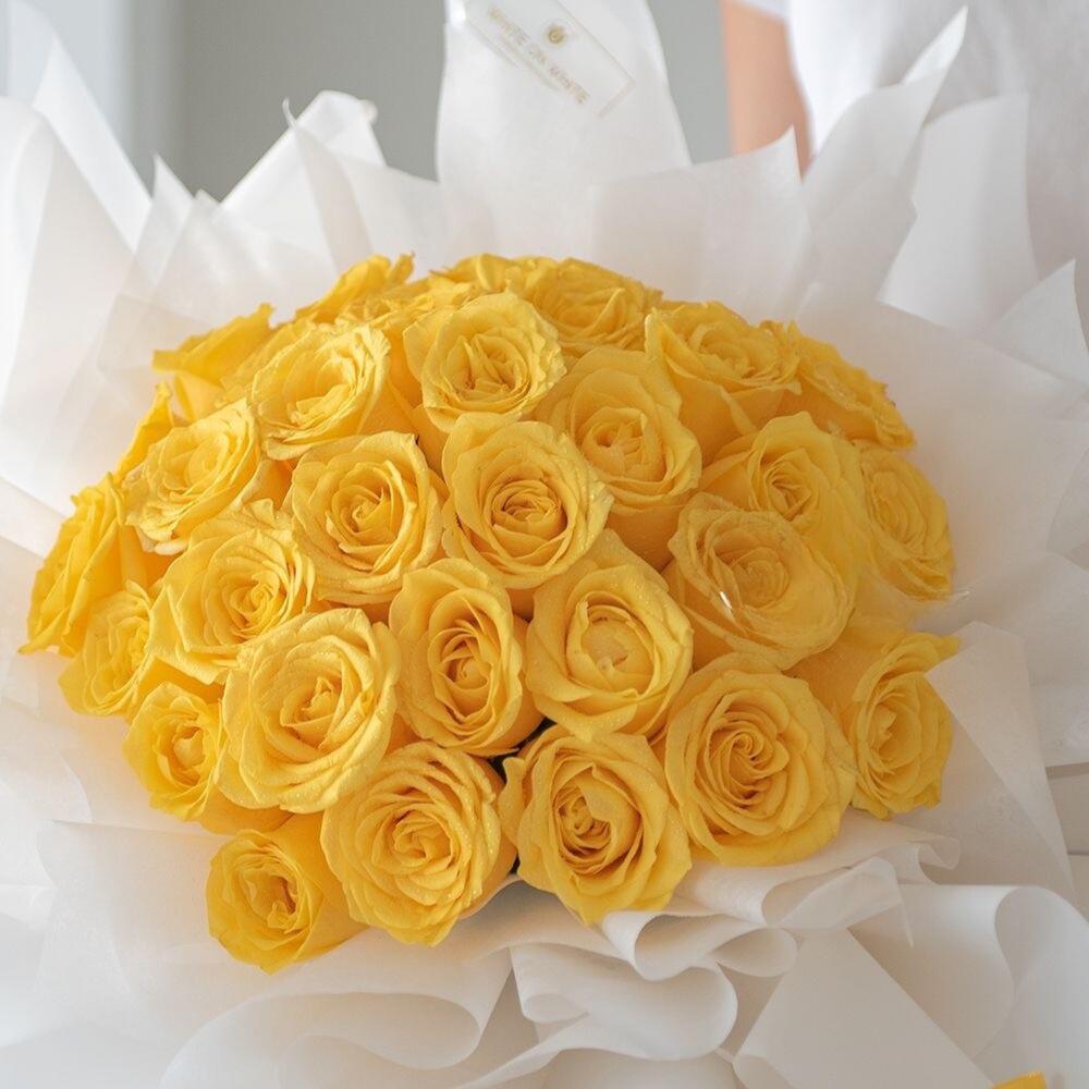 Immerse yourself in the vibrant radiance of this Mono Bouquet, composed of 35 stunning yellow roses. Each bud is an expression of joy and sunshine, carefully handpicked to create a bunch that will brighten the day of any recipient. These roses, rich in warm hues, stand as a symbol of friendship and care, making the bouquet a perfect choice to express genuine sentiments. Its not just a bouquet, its a wholehearted emotion expressed through the beauty of nature.