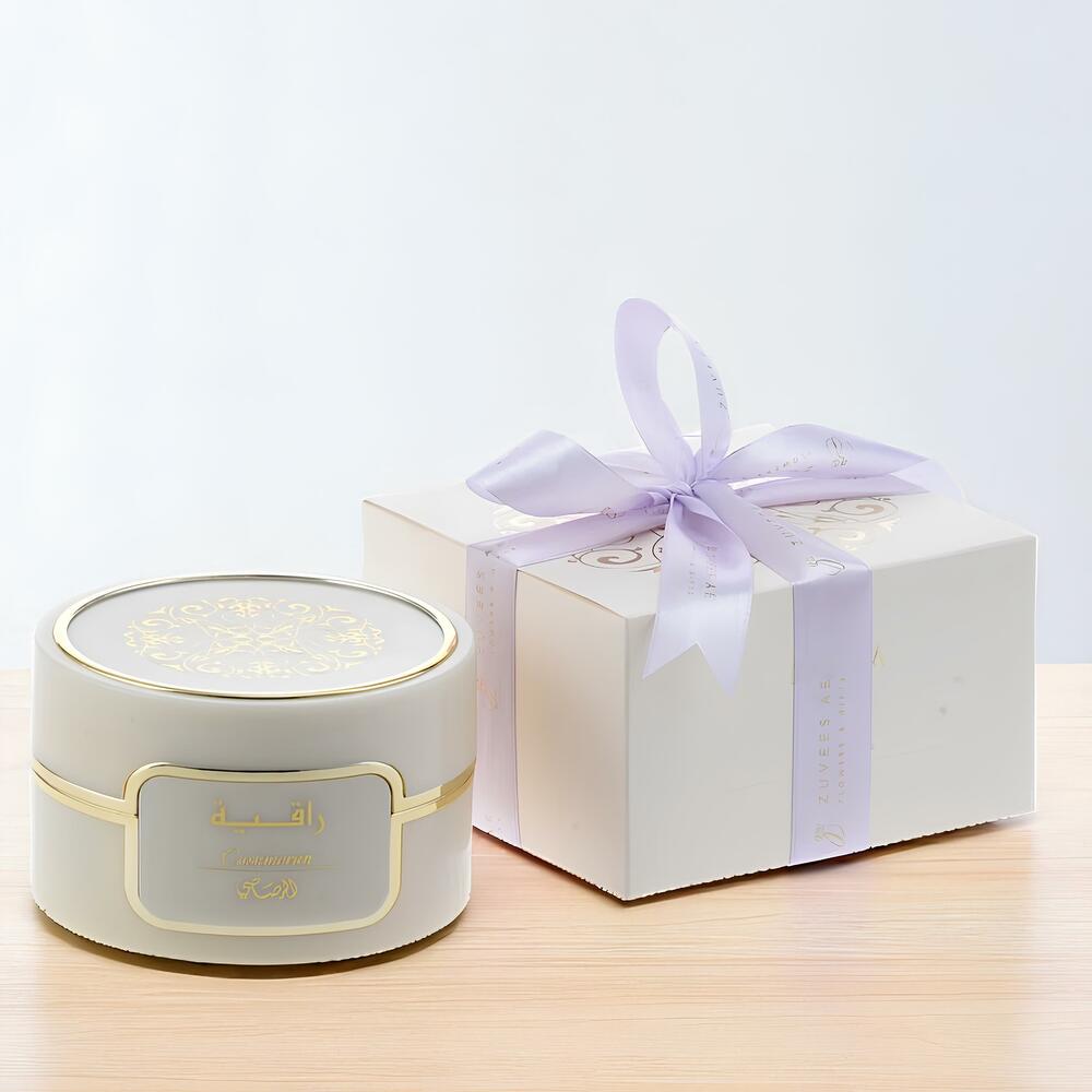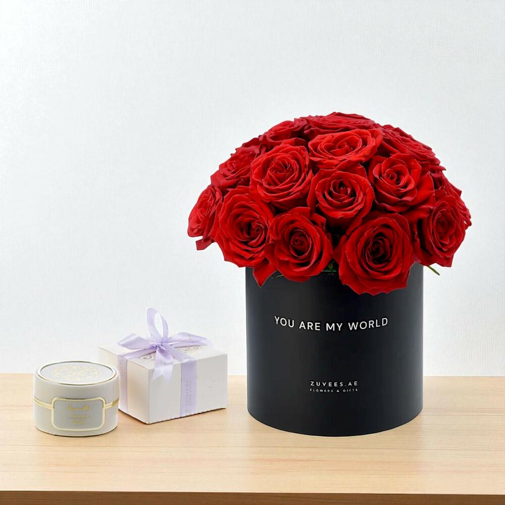 Elevate your expression of love with the You Are My World Roses Rasasi Bakhoor Gift Set — a luxurious blend of classic romance and signature Arabian fragrance. This elegant arrangement features 20 vibrant red roses, thoughtfully placed in a sleek black box printed with the heartfelt message: “You Are My World.” To complete the experience, it’s paired with Raqiya Cashmeran Bakhoor by Rasasi (109g) — a rich, warm, and sensual scent that adds depth and meaning to your gift.