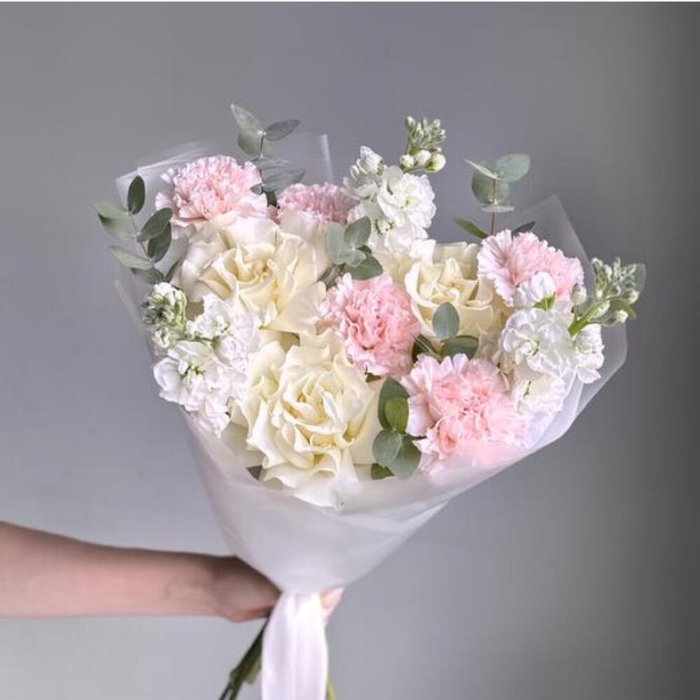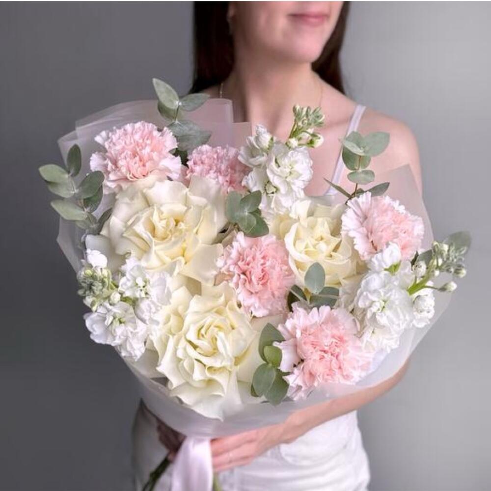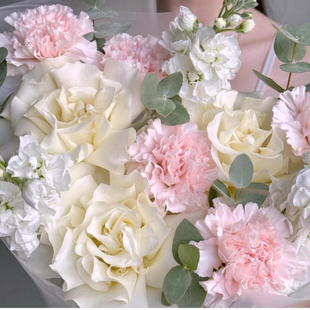 pink carnations - 5 pcs white matthiola - 3 pcs french rose white - 3 pcs