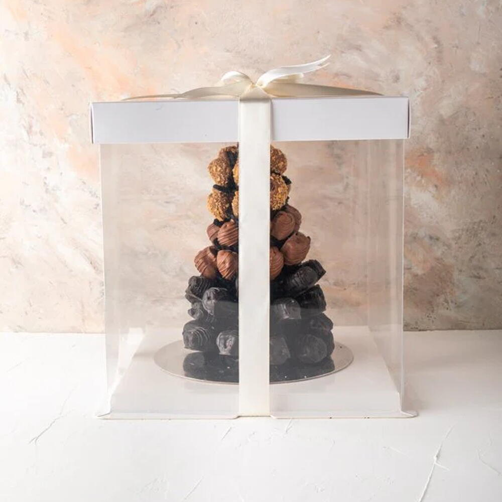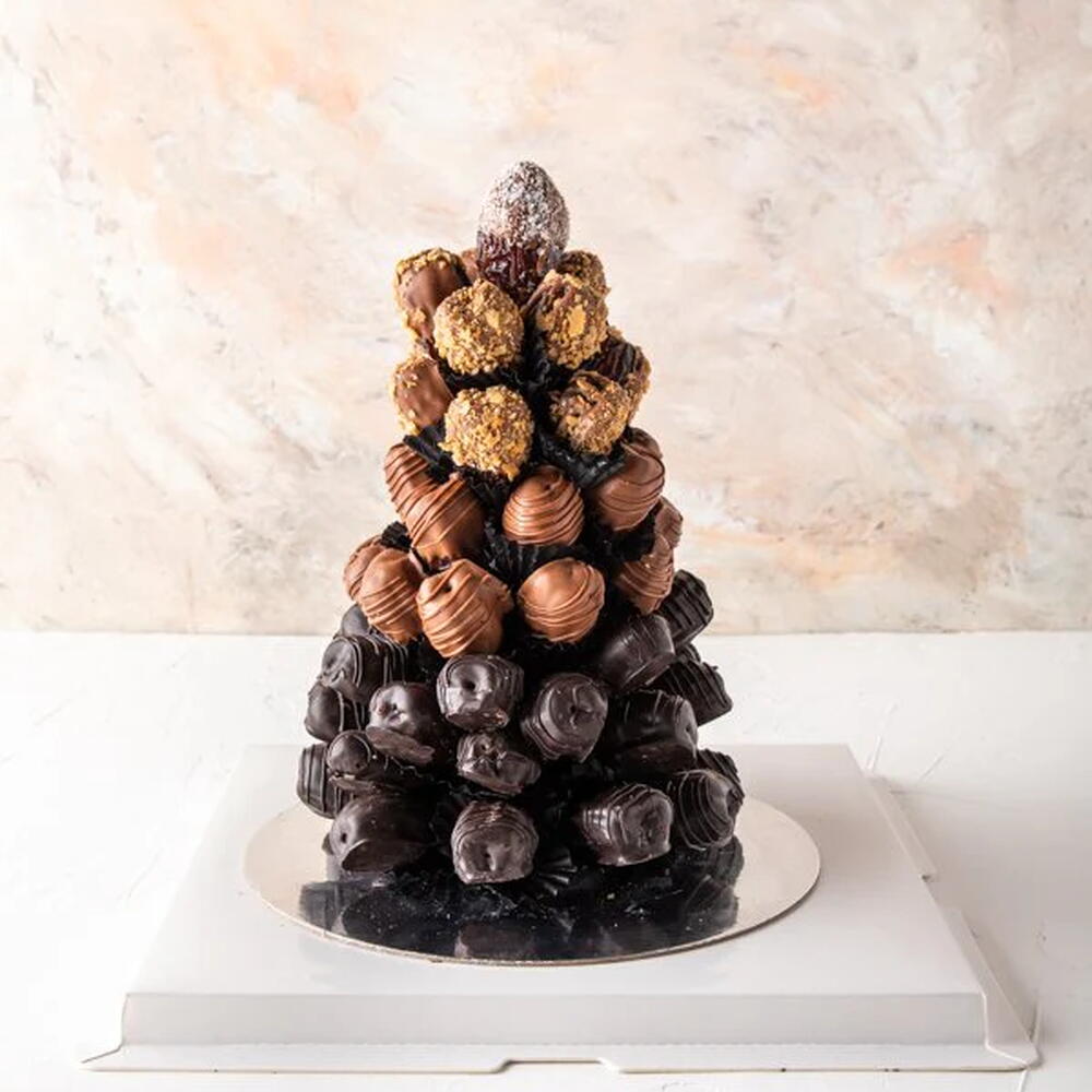 Votre cadeau contient : 47 dattes enrobées de chocolat aux saveurs assorties Chocolat au lait Chocolat noir Saveur lotus Saveur noix de coco Dimensions de la boîte/du plateau : L x l x H : 20 x 20 x 20 cm