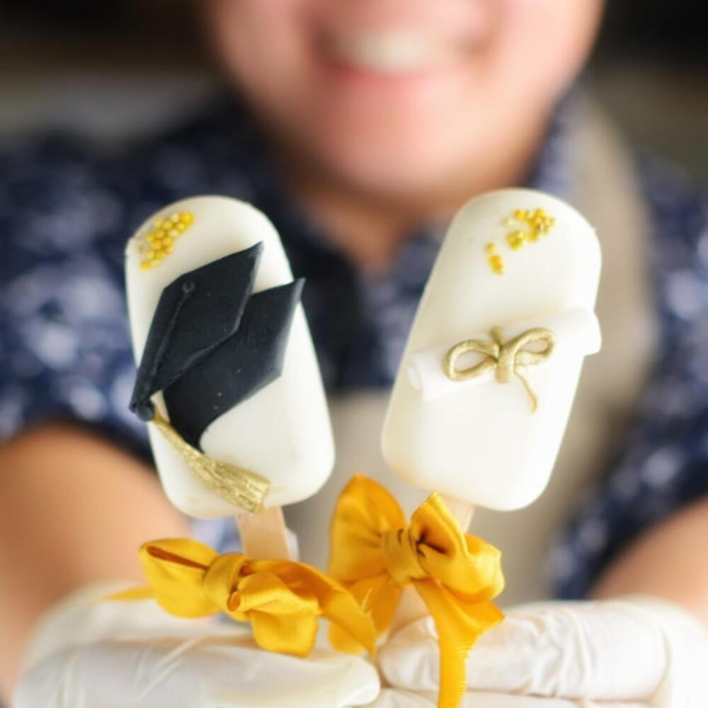 Deux cakesicles, chacun garni de cupcakes à la vanille et au chocolat. Enrobés de chocolat blanc et décorés d'un motif en fondant sur le dessus.