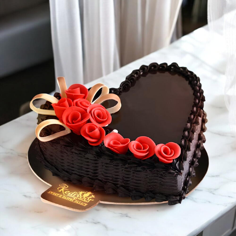 Célébrez l'amour et la douceur avec notre Gâteau Bonheur du Cœur, un chef-d'œuvre en forme de cœur conçu pour impressionner. Ce dessert gourmand présente des couches de génoise au chocolat riche, enveloppées d'une onctueuse ganache au chocolat noir et surmontées d'un glaçage brillant au chocolat. Orné d'élégantes roses rouges en sucre et de délicats rubans en chocolat blanc, ce gâteau est aussi splendide que délicieux. Que ce soit pour un anniversaire, la Saint-Valentin ou un moment spécial « juste parce que », ce gâteau est l'expression parfaite de l'amour.