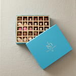 7 pièces de fraises enrobées de chocolat au lait 5 pièces de fraises enrobées de chocolat blanc 3 pièces de fraises enrobées de chocolat rose 15 pièces de purs chocolats belges assortis