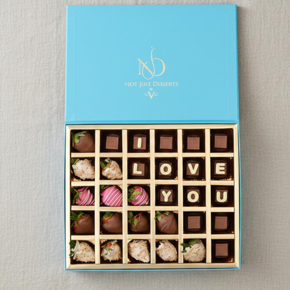 Boîte personnalisée JE T'AIME avec des fraises fraîches au parfum sucré, enrobées de chocolat pur, et des chocolats assortis belges gourmands.