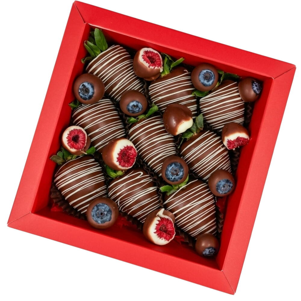 Colorée et vibrante, la Mira Box réunit des fraises enrobées de chocolat au lait belge, des framboises et des myrtilles fraîches. Parachevée de délicats filets de chocolat blanc, elle est ludique, attentionnée et délicieuse.