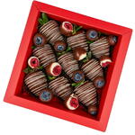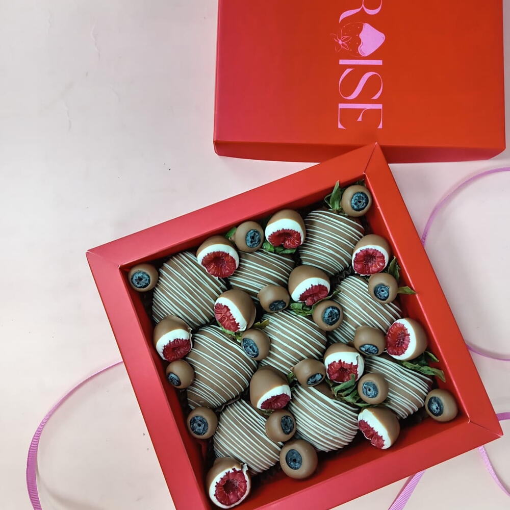9 fraises enrobées de chocolat au lait belge avec filets blancs 11 framboises enrobées de chocolat au lait belge 17 myrtilles enrobées de chocolat au lait belge