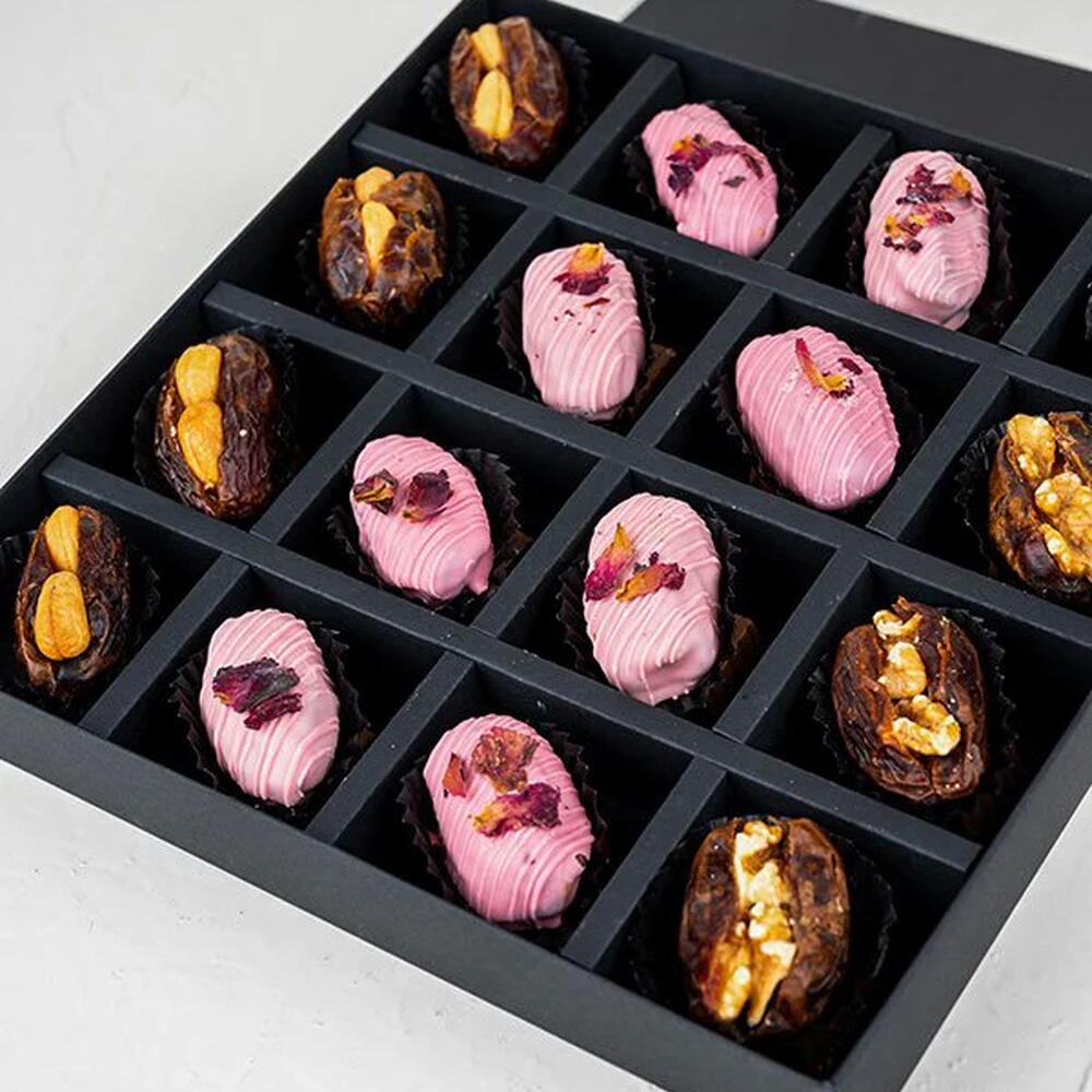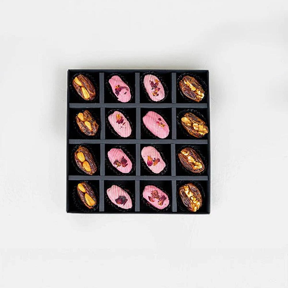 Détails Votre cadeau contient: • 8 x dattes enrobées de chocolat rose garnies de pétales de rose séchées • 4 x dattes farcies aux noix de cajou • 4 x dattes farcies aux noix • Taille de la boîte: 24x24x4cm Manipulation et stockage • Tenir à l'écart de la chaleur directe et de la lumière du soleil • À conserver de préférence entre 12-18 °C • Ne convient pas aux personnes allergiques aux graines, aux fruits à coque, aux produits laitiers CONTIENT DES FRUITS À COQUE ET DES PRODUITS À BASE DE FRUITS À COQUE