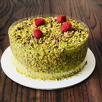 Génoise à la vanille, fourrée d'une garniture à la framboise et d'une crème à la pistache, recouverte de pistaches concassées