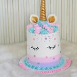 Ce gâteau exquis est une pièce maîtresse ravissante, idéale pour les anniversaires, les fêtes prénatales ou toute autre célébration magique. Design : Un gâteau haut et lisse, recouvert d'une crème au beurre onctueuse, orné d'un adorable visage de licorne. Le design comprend des cils délicatement dessinés, fermés, qui confèrent à la licorne un air serein. Décoration : Une corne dorée brillante et scintillante, ainsi que deux oreilles assorties rehaussées de détails dorés, couronnent le gâteau, lui donnant son allure mythique si particulière. Crinière : Le dessus est orné d'une somptueuse crinière en crème au beurre aux douces nuances pastel de rose poudré et de bleu œuf de merle. Palette de couleurs : Le corps du gâteau présente un élégant dégradé subtil ou un design color-block à la base, intégrant de délicates nuances de rose, de violet et de bleu. Décorations : L'ensemble du gâteau est décoré avec amour de petites décorations colorées et ludiques, notamment des étoiles et des points miniatures, qui ajoutent à son charme féérique. Bordure de base : La base est finie avec une bordure passepoilée élégante et détaillée, ornée de volutes roses et bleues assorties.