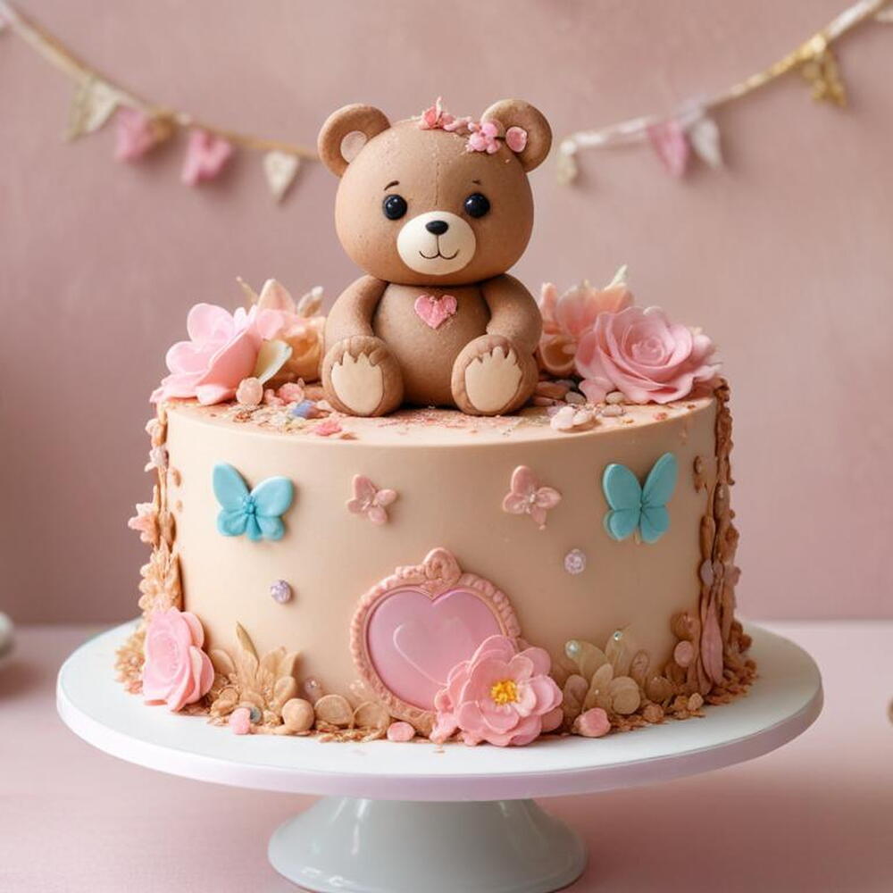 Un gâteau en forme d'ours en peluche, avec un glaçage brun doux, des yeux-boutons comestibles et un cœur sur le ventre. Cette adorable création est parfaite pour la Journée de l'ours en peluche et fera sourire n'importe qui à l'occasion de la Saint-Valentin.