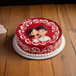 Un gâteau rond aux volutes rouges et blanches évoquant une étreinte, surmonté de figurines comestibles qui s'enlacent. Ce gâteau chaleureux est idéal pour la Journée des câlins et la Saint-Valentin, dégageant chaleur et tendresse. Rendez votre journée plus vibrante avec ce gâteau. Faites de votre Saint-Valentin un moment spécial.