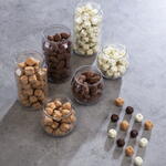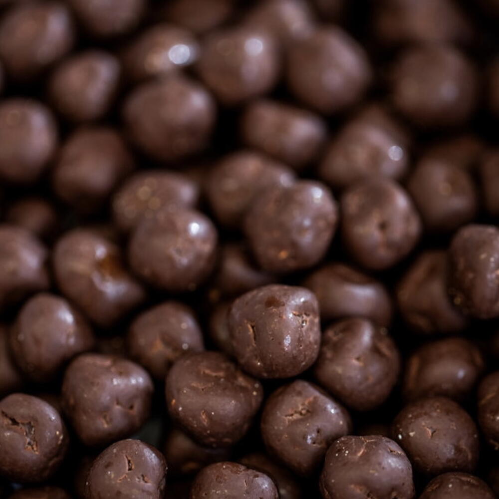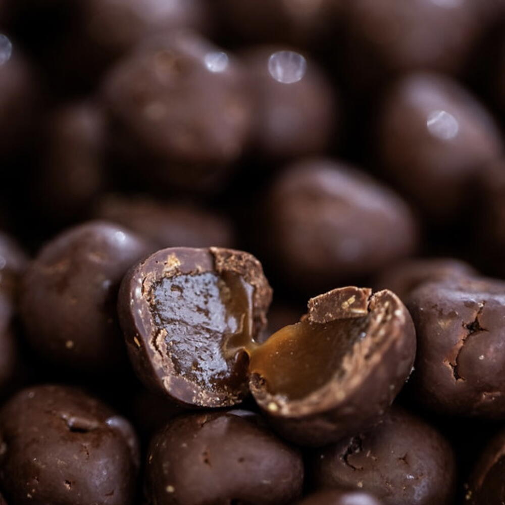 INGREDIENTS: DARK CHOCOLATE 55% (KARMA DARK BOURBON 50% — SUGAR, COCOA MASS, COCOA BUTTER, MILK FAT, EMULSIFIER: SOY LECITHIN, NATURAL FLAVORING: VANILLA), CREAM, SUGAR, GLUCOSE SYRUP, BUTTER, SALT, PEANUTS, HAZELNUTS. ALLERGENS: CONTAINS MILK, SOY, PEANUTS, TREE NUTS (HAZELNUTS), AND MAY CONTAIN TRACES OF OTHER NUTS.