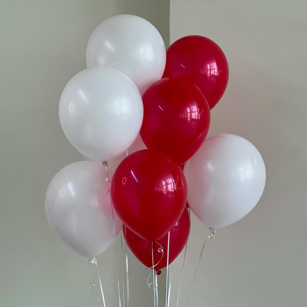 5 ballons en caoutchouc rouges et 5 blancs avec de l'hélium.