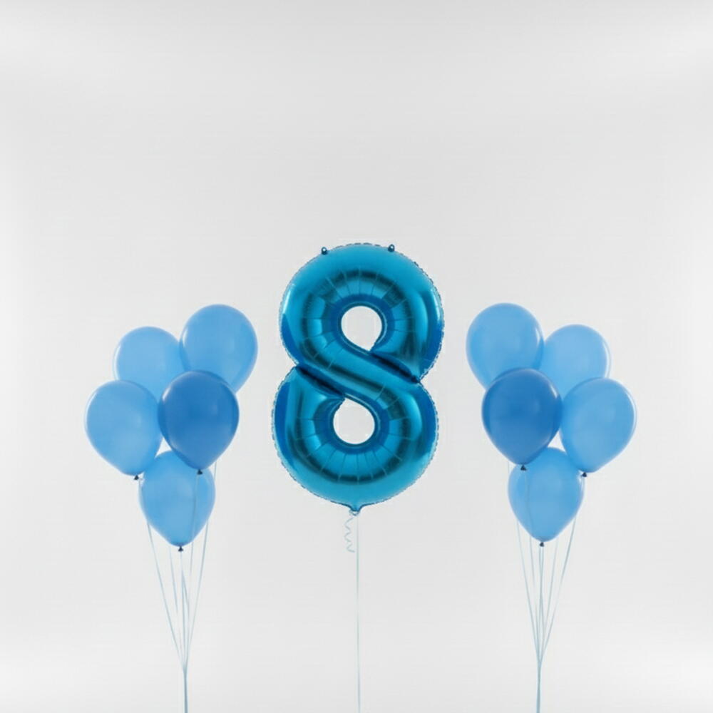 Célébrez un anniversaire de huit ans avec style grâce à ce lot de ballons chiffre huit bleu. Le lot comprend un ballon chiffre huit bleu en foil de 40 pouces et 10 ballons en latex de 12 pouces, parfaits pour la décoration d'anniversaire à thème et les fonds photo.