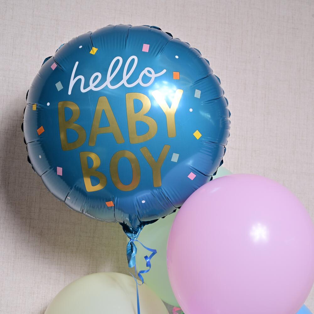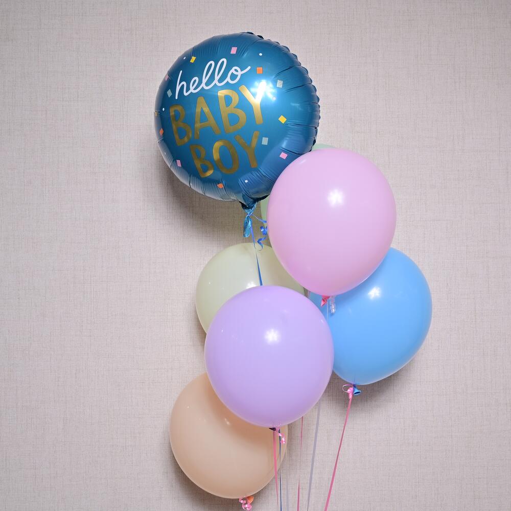 Adorable bouquet de ballons pour accueillir un bébé garçon, gonflés à l'hélium et qui flottent pendant 8–10 heures. Ballons en latex × 6 Ballon en mylar Hello Baby Boy × 1