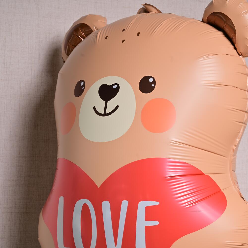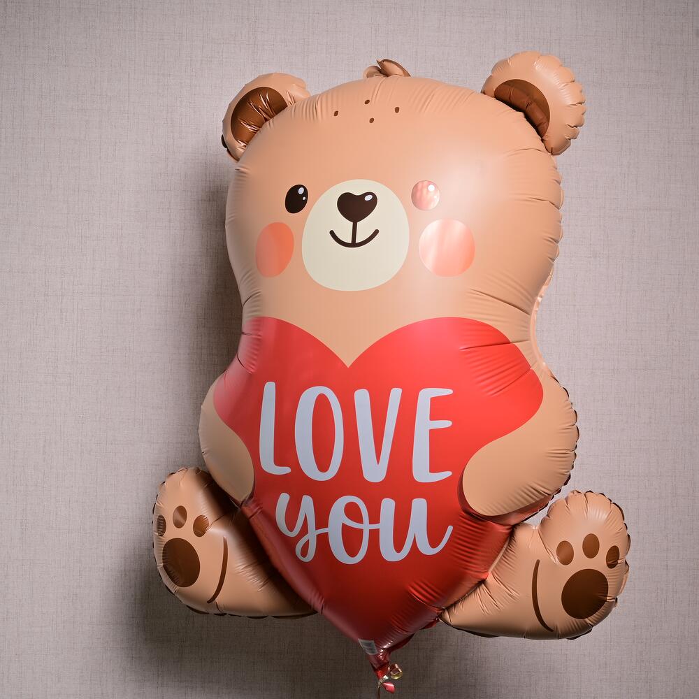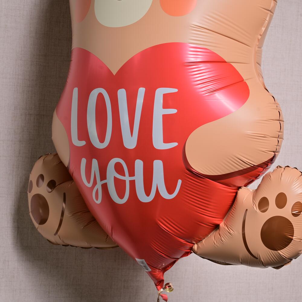 Ballon mignon en mylar en forme d'ourson, gonflé à l'hélium, avec un cœur où est écrit “JE T'AIME.” Flotte pendant 8–10 heures.