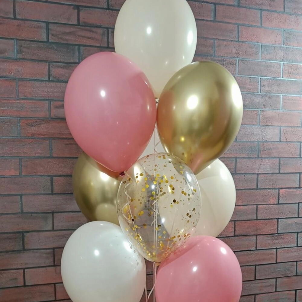 3 ballons roses en latex gonflés à l'hélium 2 ballons dorés chromés gonflés à l'hélium 4 ballons blancs en latex gonflés à l'hélium 2 ballons transparents en latex gonflés à l'hélium