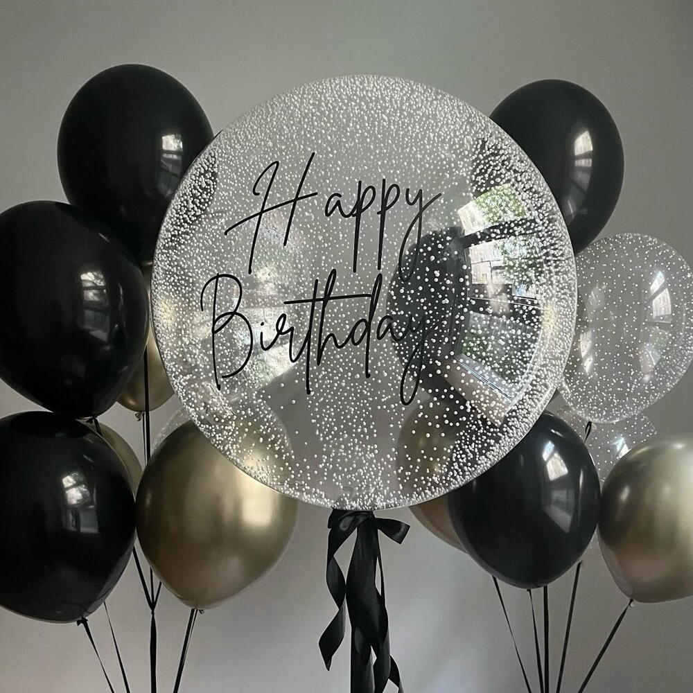 1 bubble balloon with customized text and snow 2 bunches by: 3 gold balloons 2 clear balloons with snow 3 black balloons