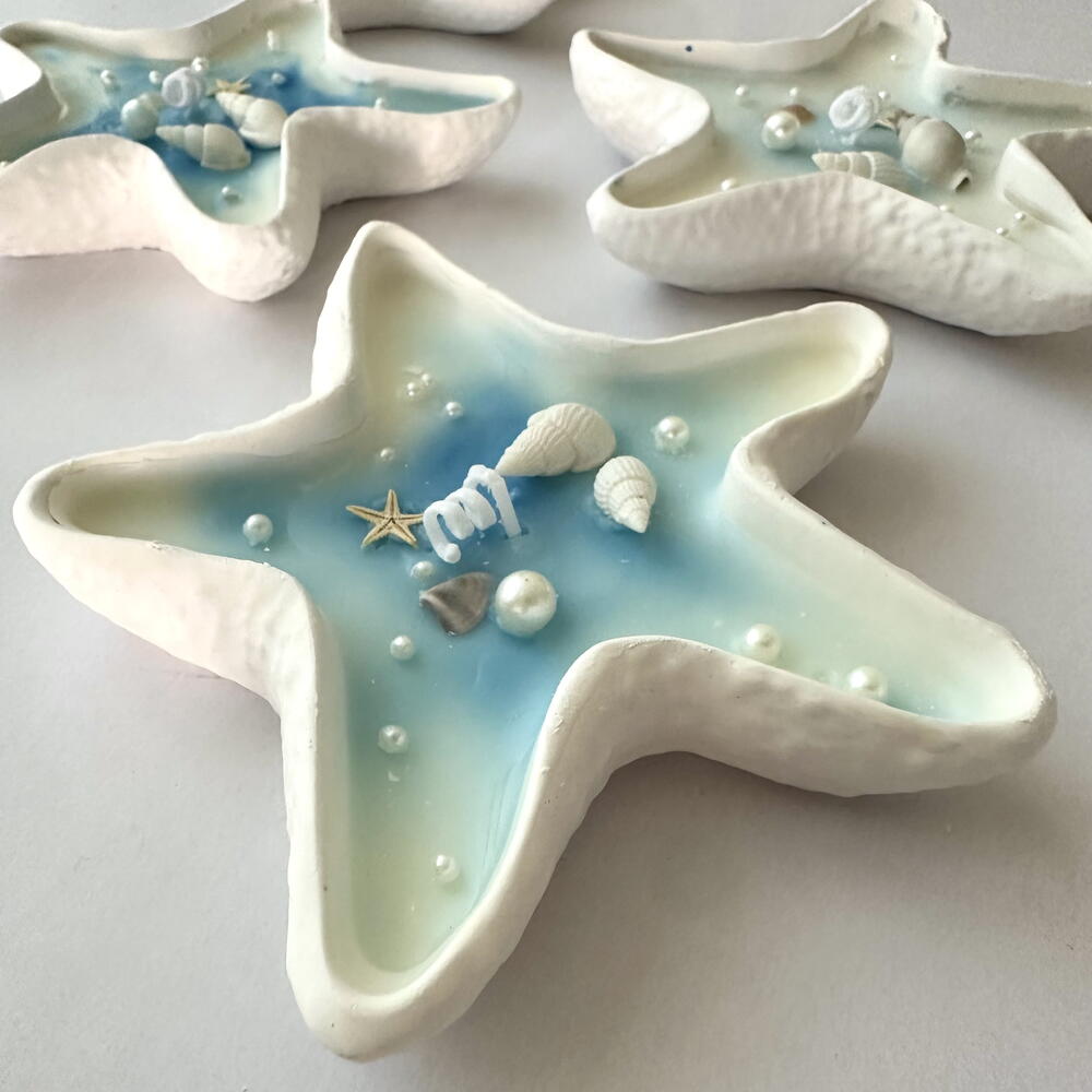 starfish-shaped candle inspired by the sea, handcrafted with smooth natural wax. a perfect coastal accent for gifts, summer decor, or relaxing spa vibes at home.