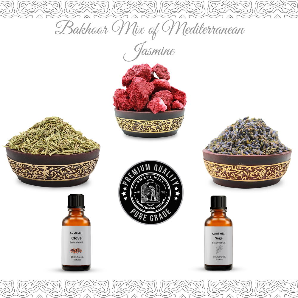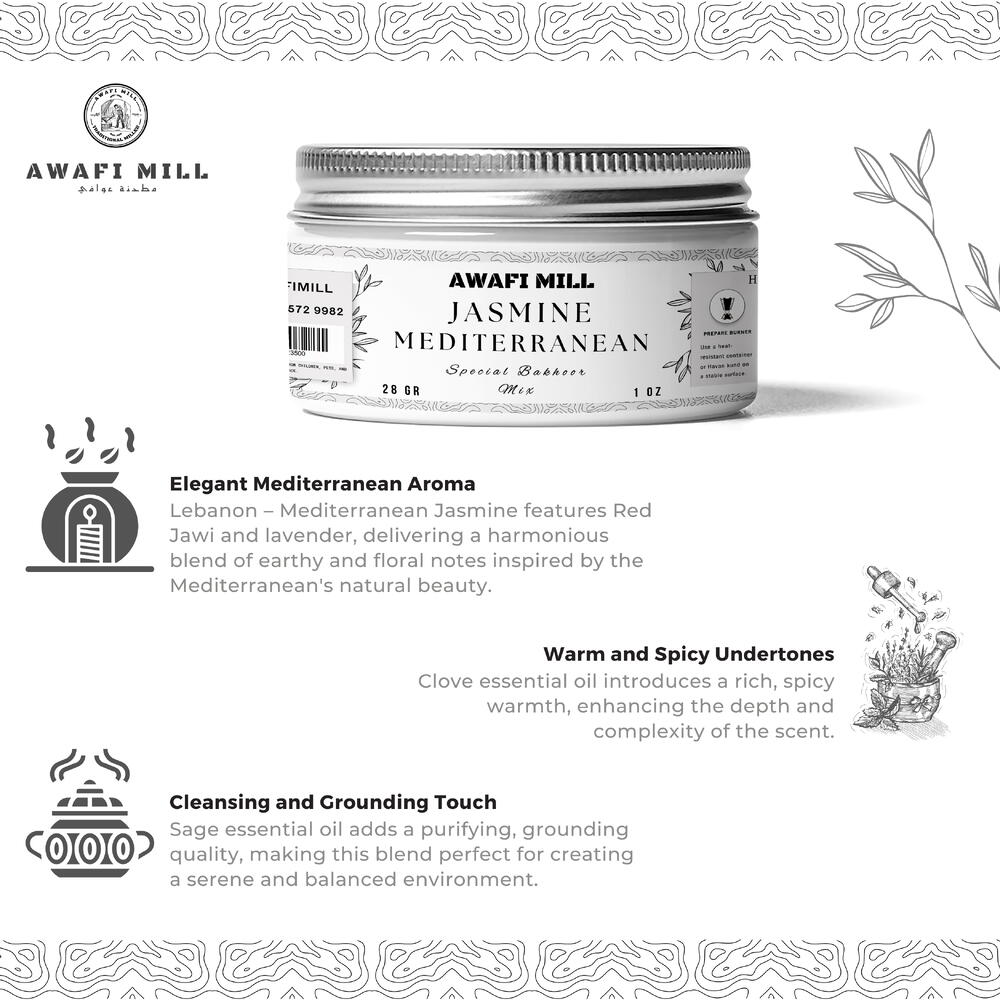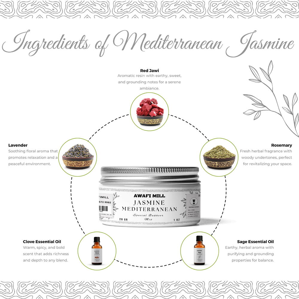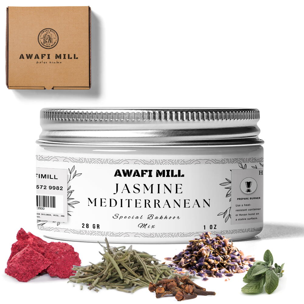 AWAFI MILL présente le Mélange Bakhoor Jasmin Méditerranéen, un mélange premium qui combine les meilleurs ingrédients de la nature pour une expérience rafraîchissante et aromatique. Composé de Red Jawi, de lavande, de romarin, d'huile essentielle de clou de girofle et d'huile essentielle de sauge, ce mélange d'encens est conçu pour sublimer votre espace avec un parfum stimulant et apaisant. Inspiration mondiale : Moyen-Orient : Red Jawi et la lavande évoquent les riches et anciennes traditions aromatiques de la région, connues pour leurs qualités purifiantes. Europe : Le romarin et les huiles essentielles de sauge apportent des notes calmantes et ancrantes qui créent une atmosphère sereine, idéale pour la relaxation. Influence méditerranéenne : Le parfum capture l'essence de la Méditerranée, offrant une senteur fraîche et revitalisante. Bienfaits et utilisation : Purifie et rafraîchit l'air : Imprégnez votre espace d'un arôme purifiant et revitalisant, parfait pour rehausser l'atmosphère. Apaisant et relaxant : Idéal pour la relaxation, la méditation ou pour améliorer l'ambiance de n'importe quelle pièce grâce à son parfum apaisant. Idéal pour la maison et le bureau : Parfait pour transformer n'importe quel espace en un environnement serein et rafraîchissant. Rituels aromatiques : Idéal pour une utilisation lors de rituels spirituels, de cérémonies de prière, ou tout simplement pour créer une ambiance paisible chez vous. Comment utiliser : Préparez un brûleur résistant à la chaleur ou du charbon. Allumez le charbon jusqu'à ce qu'il soit chaud. Placez une petite quantité du Mélange Bakhoor Jasmin Méditerranéen sur le charbon chaud ou sur un brûleur électrique. Laissez le parfum remplir votre espace, favorisant la tranquillité et la relaxation.