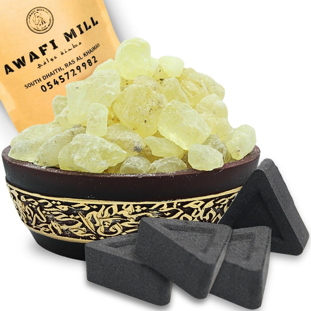 AWAFI MILL Résine d'encens Copal blanc | Pastille de charbon triangulaire - Pack de 120 grammes avec 20 pastilles de charbon