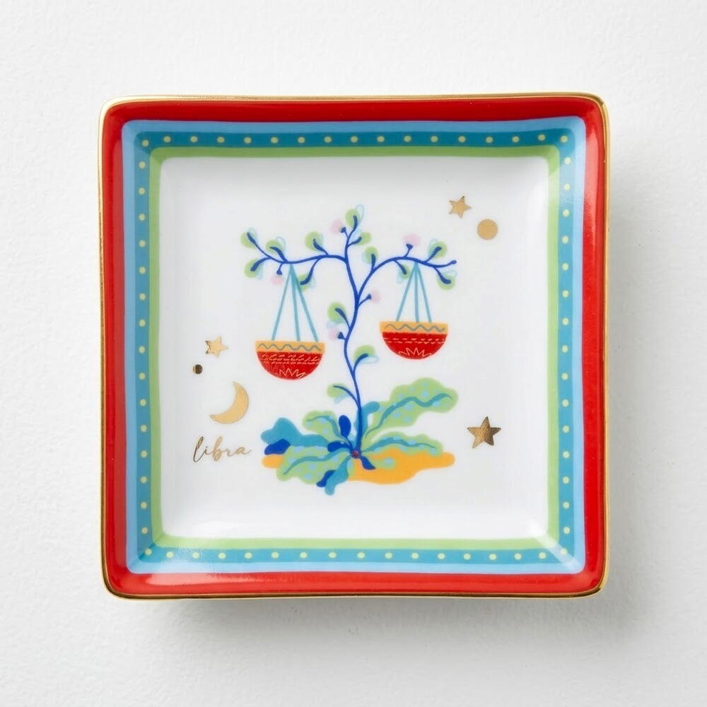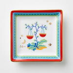 Plateau carré en porcelaine de la collection raffinée Zodiac Vibe, un voyage poétique à travers l'astrologie qui célèbre la beauté et le mystère du cosmos avec style et sophistication. Cette pièce est dédiée au signe du zodiaque Balance, symbolisé par une paire de balances délicatement suspendues au sein d'une composition botanique gracieuse. Entouré de subtils éléments célestes tels que des étoiles et un croissant de lune, le motif évoque l'harmonie, l'équilibre et un sens de justice — des qualités traditionnellement associées à la Balance. La palette de couleurs, à la fois douce et vibrante, mêlant des verts délicats, des bleus et des touches de rouge chaud, crée une composition sereine et visuellement agréable, tandis que la bordure décorative ajoute une touche moderne et raffinée. Fabriqué en porcelaine fine aux finitions lumineuses, ce plateau allie élégance artistique et fonctionnalité au quotidien. Parfait pour accueillir des bijoux, des pièces ou de petits objets personnels, il sert également d'accent décoratif sophistiqué qui apporte équilibre, beauté et une touche d'inspiration cosmique dans n'importe quel espace.