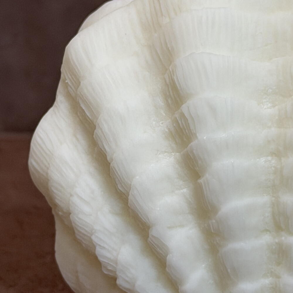 Notre bougie Ocean Muse apporte le rythme apaisant des vagues à votre intérieur. Avec ses crêtes délicates et son esthétique douce et nacrée, elle est le rappel parfait des journées d'été et des brises marines. • Le design : texture de coquillage complexe avec une finition lisse et mate.