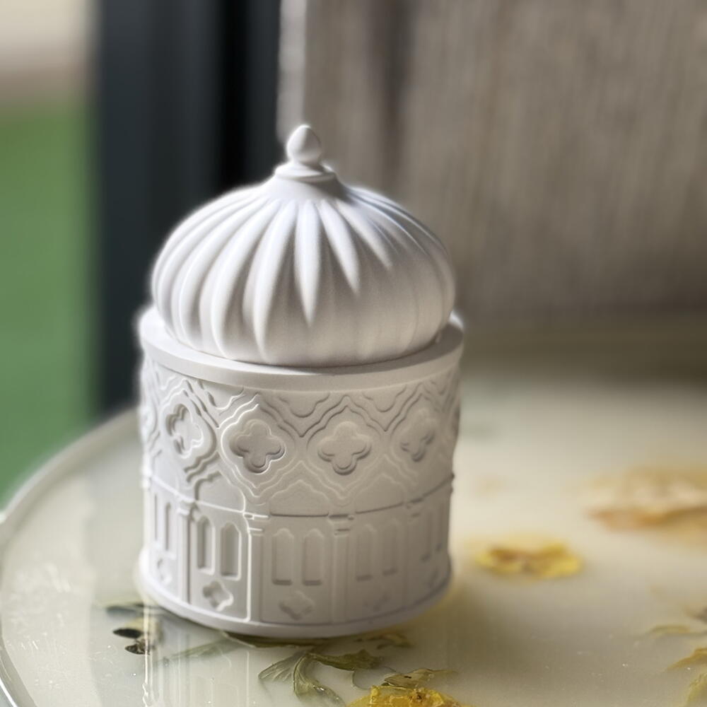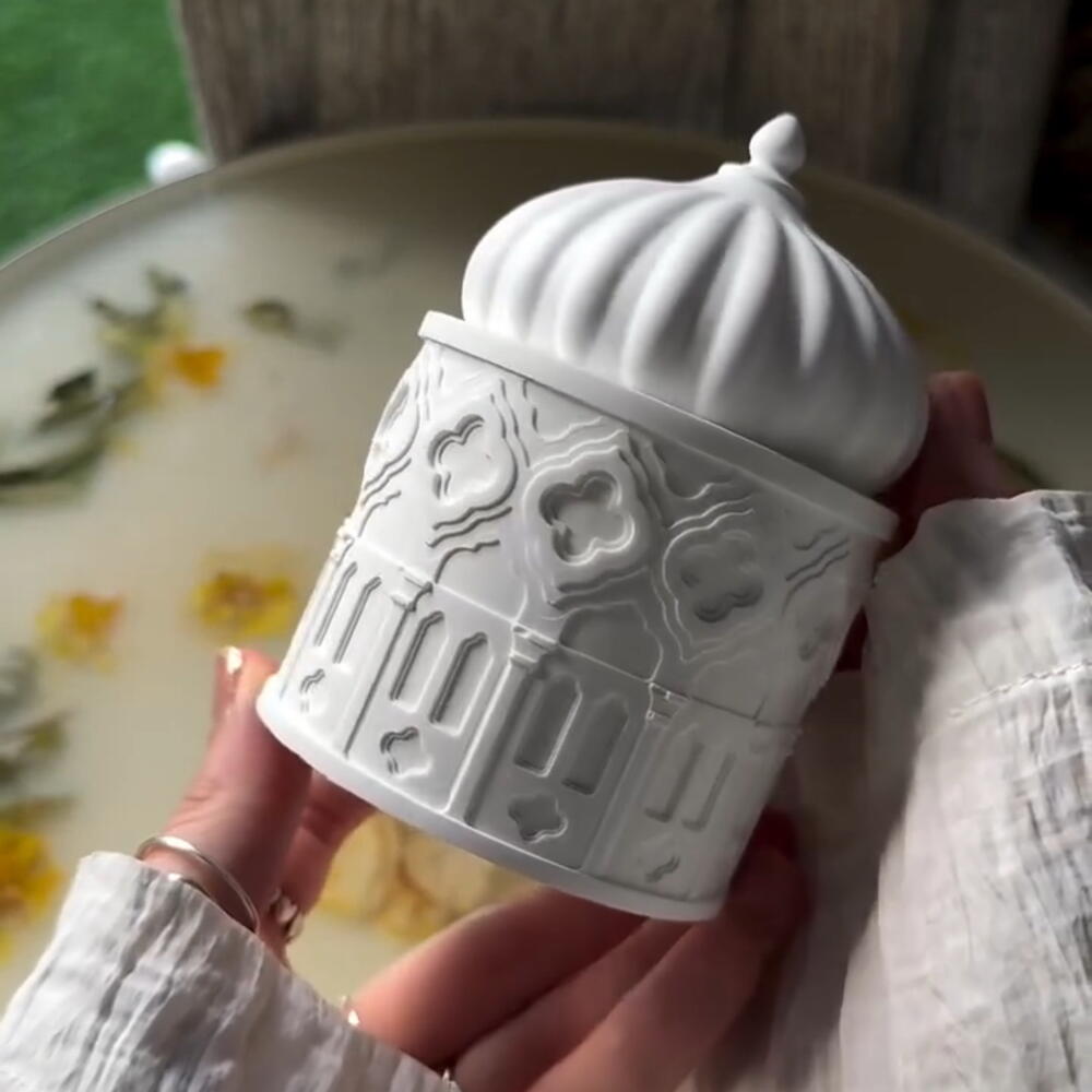 Cette bougie délicate est façonnée en forme d'élégant pot inspiré des mosquées, coiffé d'un couvercle bombé – symbole de lumière, de chaleur et de la beauté spirituelle du Ramadan. Ses détails architecturaux raffinés reflètent le design traditionnel du Moyen-Orient, créant une atmosphère sereine et sophistiquée dans votre intérieur. Allumée, la bougie diffuse une douce lueur chaleureuse, favorisant la paix et le recueillement durant le mois sacré. Idéal comme : • Un cadeau significatif pour le Ramadan • Une décoration élégante pour le Ramadan • Un élément central spirituel pour les repas de l'Iftar • Une touche raffinée pour votre intérieur Une pièce intemporelle qui allie tradition, design et la douce lumière d'une bougie. 150 g de cire de soja parfumée au santal. Durée de combustion : environ 4 heures