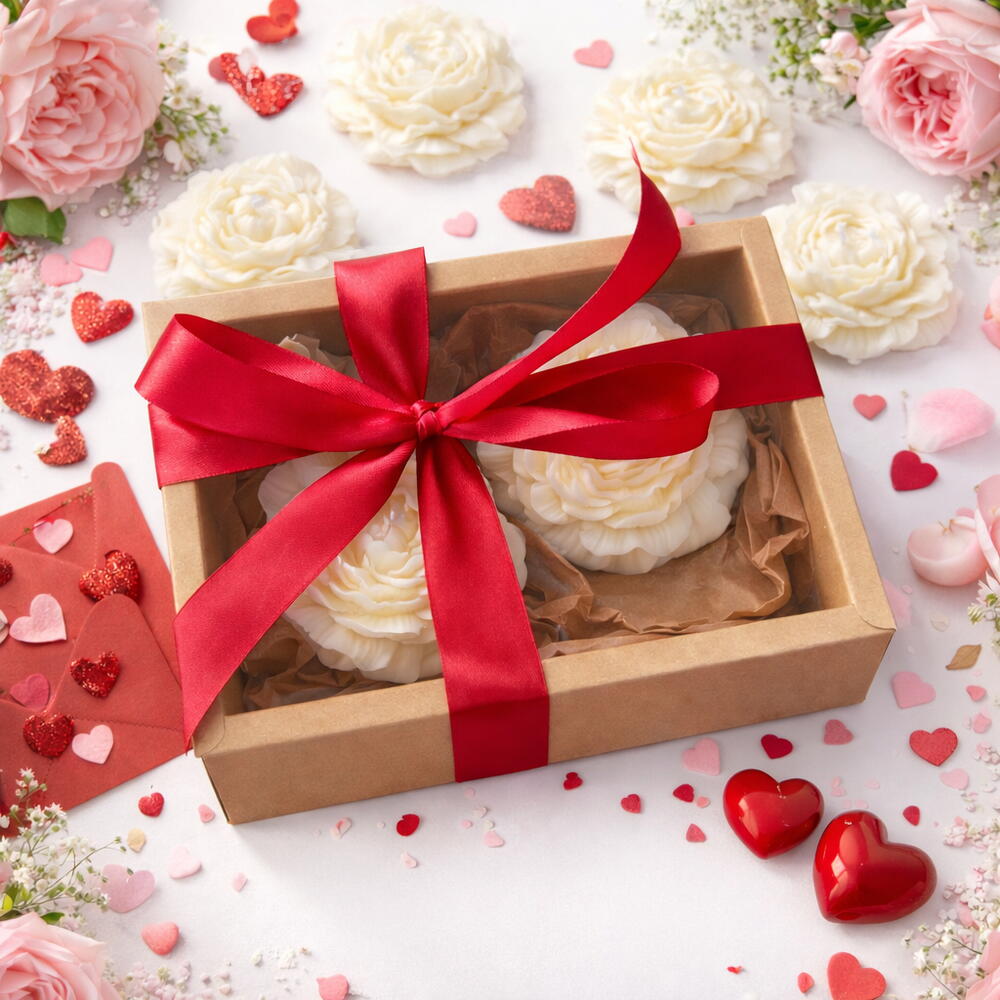 Un coffret cadeau romantique composé de deux bougies colonnes sculptées en forme de pivoine, joliment présenté dans une boîte cadeau avec un ruban rouge — conçu pour célébrer l'amour et les moments cocooning. Contenu : 2 × Bougies colonnes sculptées en forme de pivoine Design floral sculpté avec un délicat parfum de pivoine Boîte cadeau avec ruban rouge, prête à être offerte Type de produit : Coffret de bougies parfumées Bougies : 2 bougies colonnes Parfum : Pivoine Style : Floral, romantique, décoratif Emballage : Boîte cadeau en kraft avec ruban