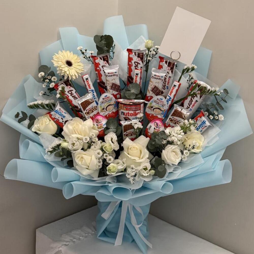 Statice - 10 pce Eucalyptus - 6 pce Gerbera - 1 pce rose - 7 pce Mélange de Kinder - 20 pce rose bébé - 3 pce