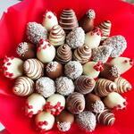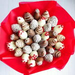 Bouquet de Fraises en Chocolat de Luxe Surprenez vos proches avec ce magnifique bouquet de fraises gourmandes enrobées de chocolat, joliment présentées dans un emballage rouge vif pour une présentation luxueuse et romantique. Chaque fraise fraîche est trempée à la main dans du chocolat blanc, au lait ou noir de première qualité, et décorée d'élégants filets, de noix de coco râpée, de vermicelles croquants ou de morceaux de fraises séchées. Un cadeau idéal pour les anniversaires, la Saint-Valentin ou toute autre occasion spéciale. Fait sur commande | Élégant, gourmand et inoubliable