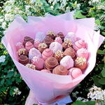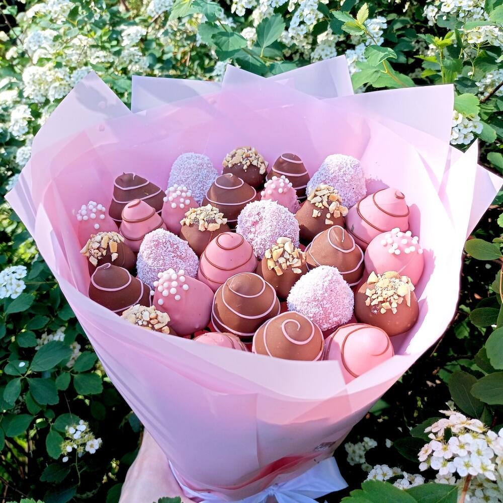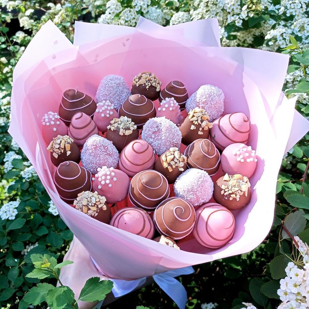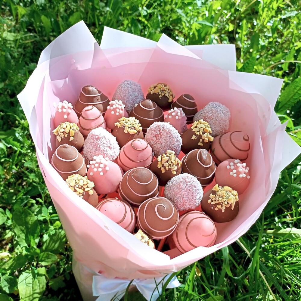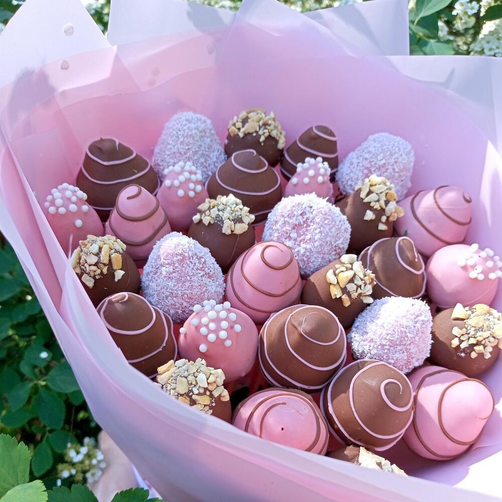 Un bouquet époustouflant qui ravira les yeux et les papilles ! Cette composition artisanale se compose d'un assortiment de truffes enrobées de chocolat aux tons rose et marron, joliment emballées dans un papier rose tendre. Chaque truffe est décorée de volutes, de vermicelles, de flocons de noix de coco ou de noix croquantes, rendant ce bouquet aussi délicieux que beau. 💐 Contient : Truffes au chocolat assorties (chocolat au lait, rose et blanc) Nappes décoratives : noix, vermicelles, noix de coco et motifs en filet Emballé dans un élégant papier bouquet rose avec un ruban de satin 🎁 Idéal pour : Anniversaires, Saint-Valentin, Fête des Mères ou pour une douce surprise.