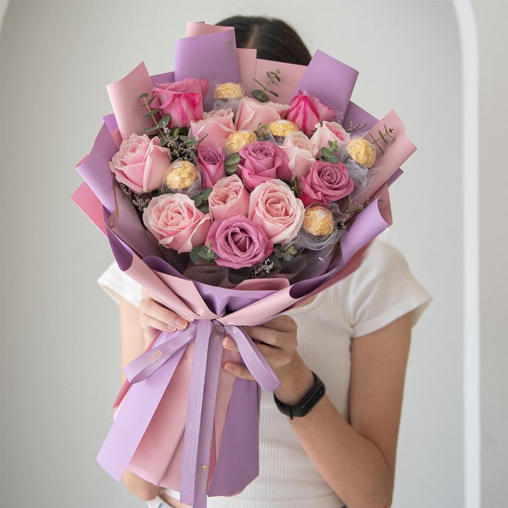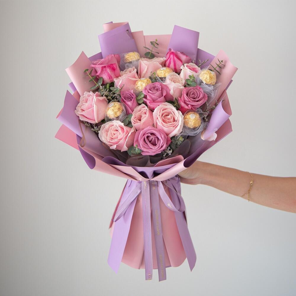 Pink rose - 10 pce eucalyptus leaves - 10 pce fererro rocher - 6 pce roses fuchsia - 5 pce lavender statice - 10 pce