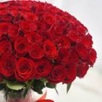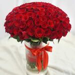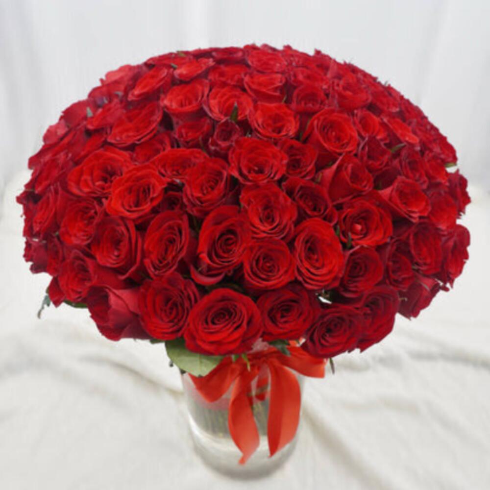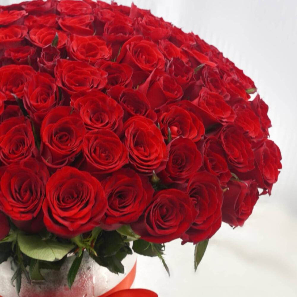 Une somptueuse composition de 100 roses rouges de qualité supérieure, élégamment disposées dans un vase et ornées d'un nœud décoratif rouge. Parfait pour les anniversaires, la Saint-Valentin, les surprises romantiques ou pour rendre n'importe quel moment inoubliable.