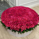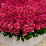D'innombrables roses rose fuchsia fraîchement coupées sont serrées les unes contre les autres, créant une présentation dense en forme de dôme, riche en couleurs vives et en textures. Grande envergure : Le volume même des roses en fait une composition grandiose et impressionnante, adaptée pour faire une déclaration significative. Présentation élégante : La boîte blanche et le feuillage vert entourant la base offrent un contraste net et élégant avec les fleurs rose vif.