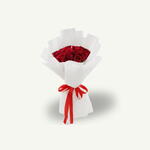 Bouquet noué à la main de 15 roses rouges fraîches, délicatement présenté dans un élégant emballage blanc, une expression intemporelle d'amour et d'élégance.