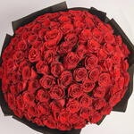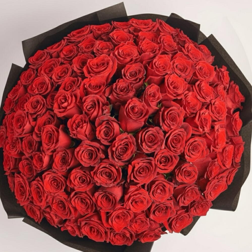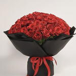 Une présentation opulente et à couper le souffle de 101 magnifiques roses d'un rouge profond, parfaitement enveloppées dans un papier noir élégant et contrastant et attachées d'un ruban rouge flamboyant. C'est plus qu'un cadeau — c'est une déclaration. Parfait pour les étapes clés, les gestes grandioses, ou simplement pour chuchoter «Je t'aime» avec un impact maximal. Le romantisme pur, redéfini.