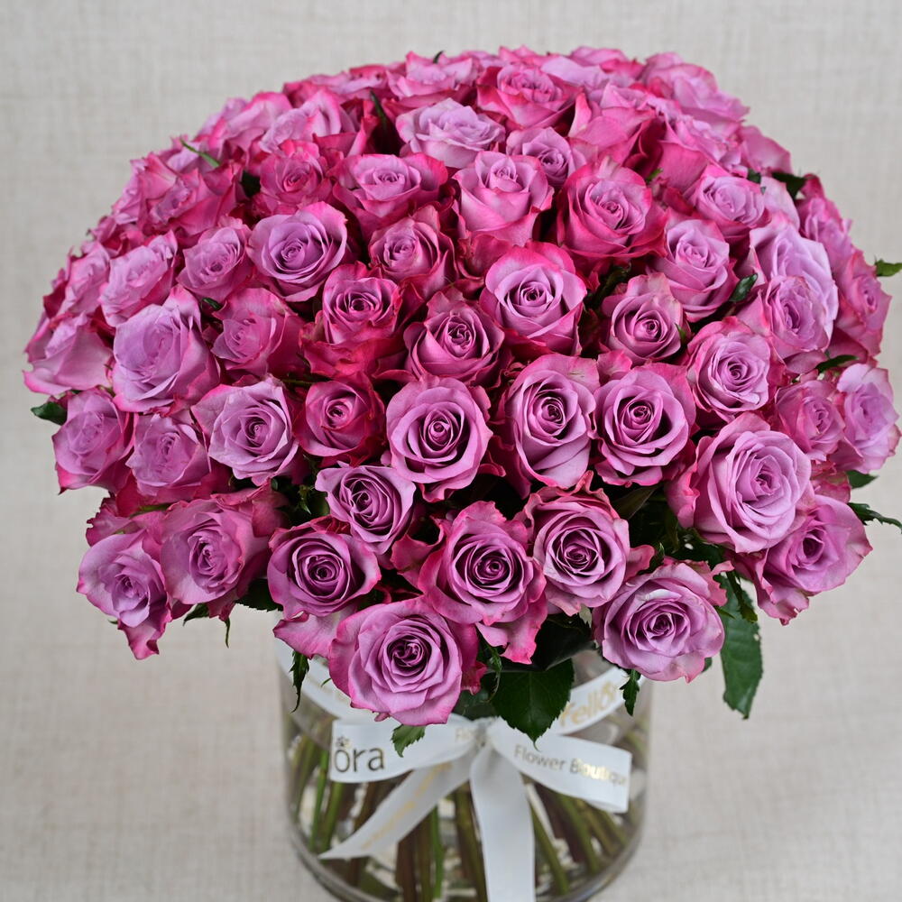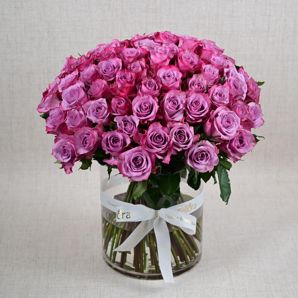 rose violette - 101 pce ribbon satin - 1 pce vase cylindrique - 1 pce