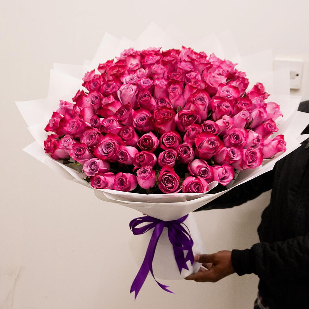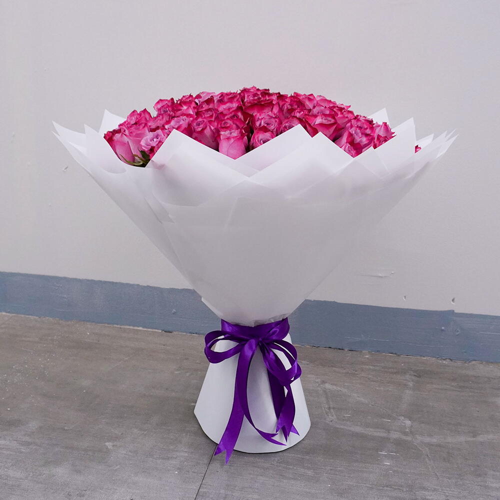 Offrez l'expression ultime de l'amour avec un somptueux bouquet composé de 101 roses violettes envoûtantes. Ces fleurs vibrantes et de qualité supérieure sont soigneusement assemblées, enveloppées de 8 feuilles d'emballage blanc immaculé pour une touche d'élégance supplémentaire. Le bouquet est ensuite élégamment maintenu par un unique ruban violet assorti, noué en un beau nœud. Ce bouquet monochrome n'est pas seulement un cadeau, mais un véritable symbole de splendeur et d'admiration à chérir pour toute une vie.