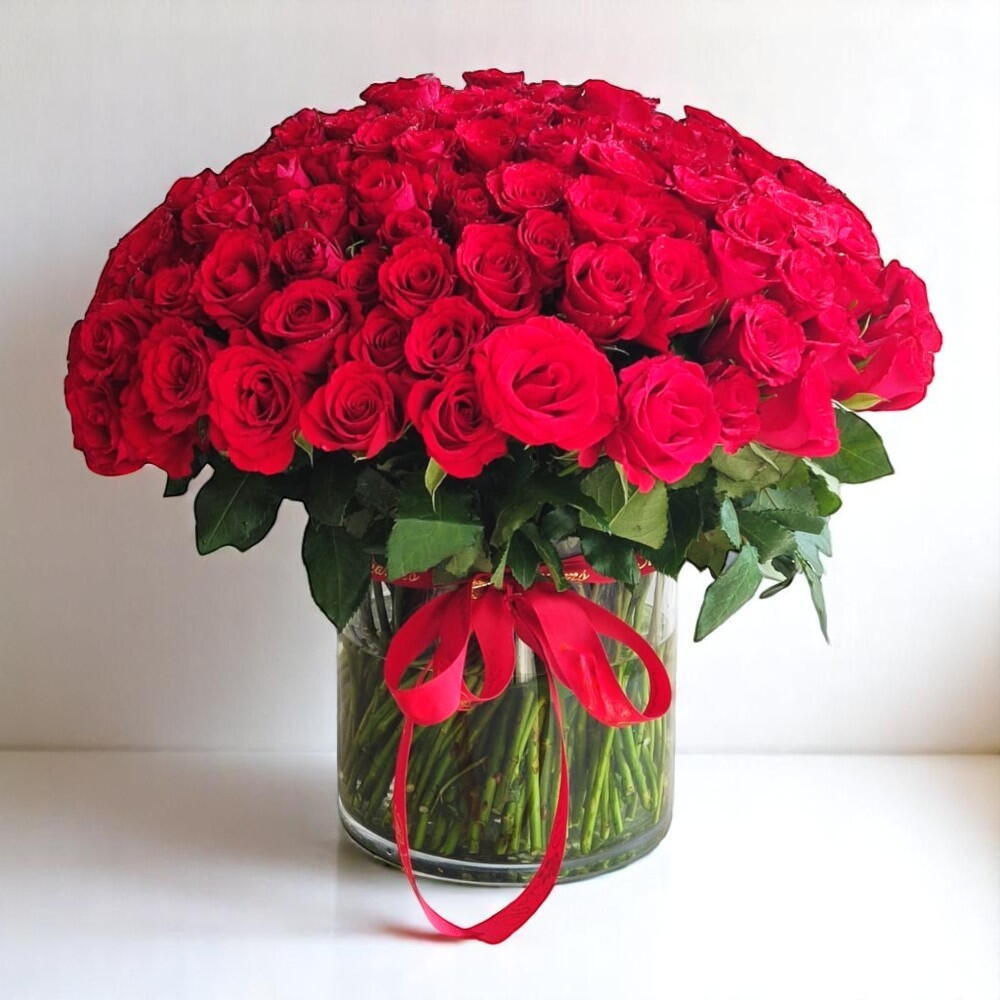 Un vase somptueux rempli de 101 roses rouges exquises, symbolisant la passion pure et le romantisme. Le geste parfait pour la Saint-Valentin qui rendra votre histoire d'amour inoubliable.