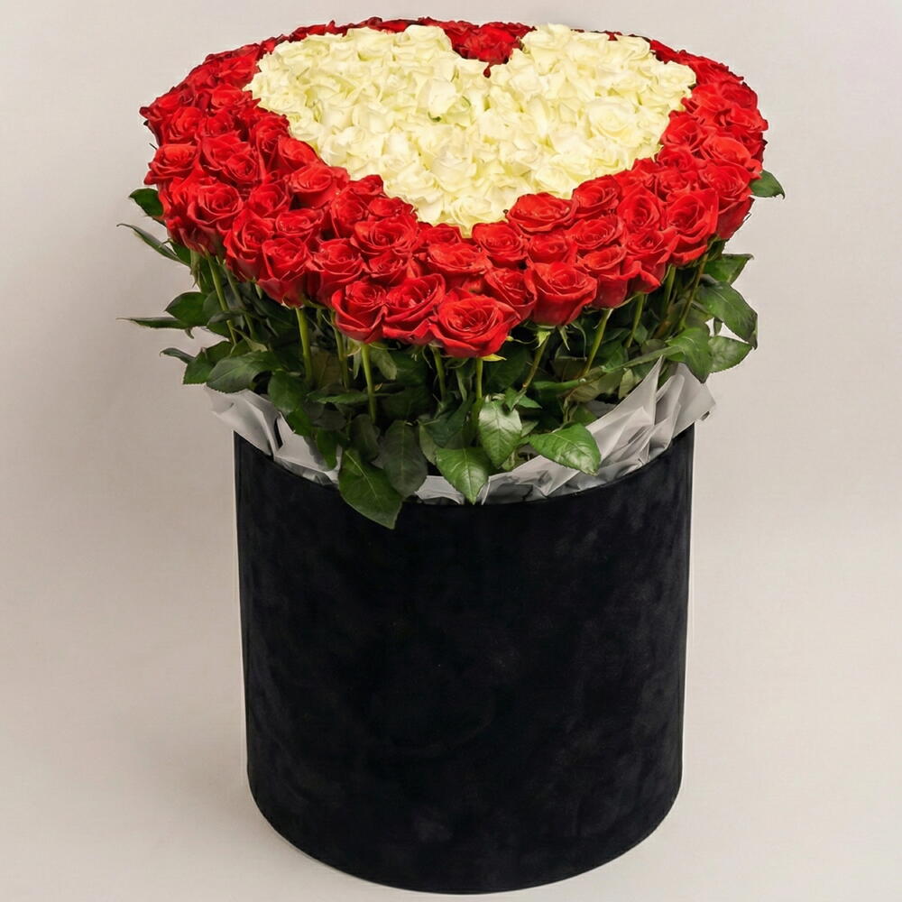 Faites une déclaration d'amour audacieuse et inoubliable avec notre boîte en forme de cœur de 101 roses rouges et blanches accompagnée de 5 ballons rouges en forme de cœur à l'hélium, une composition florale de luxe haut de gamme à Dubaï. Cette superbe boîte en forme de cœur présente 101 roses fraîches magnifiquement disposées dans un design unique — un cœur de roses blanches avec un contour saisissant de roses rouges. Le contraste élégant symbolise l'amour pur entouré d'une passion profonde. La composition est accompagnée de 5 ballons rouges en forme de cœur à l'hélium, créant une surprise grandiose et spectaculaire, parfaite pour la Saint‑Valentin, les demandes en mariage, les anniversaires ou des moments romantiques uniques dans une vie. Confectionné à la main avec des roses fraîches de qualité supérieure par Musa Flowers pour garantir élégance, fraîcheur et présentation de luxe. Disponible pour livraison le jour même à Dubaï et dans l'ensemble des Émirats arabes unis.
