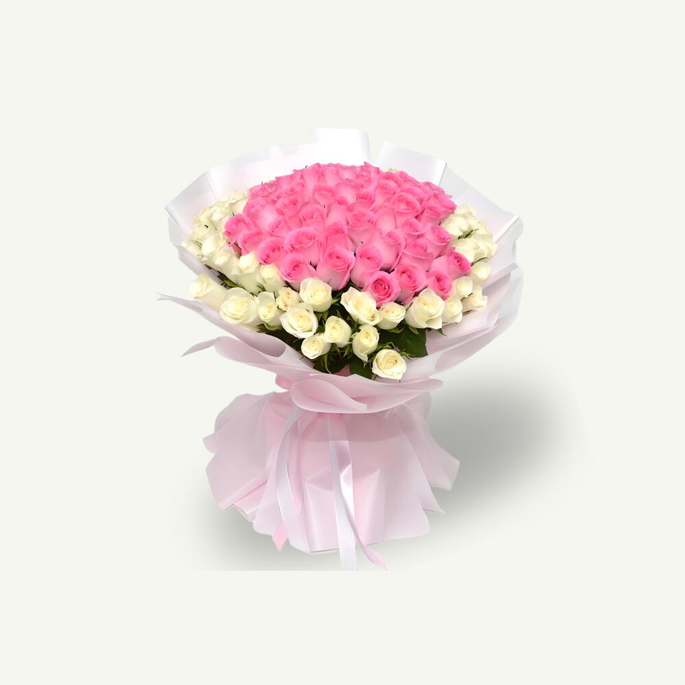 Bouquet noué à la main composé de 101 roses fraîches aux tons rose et blanc, délicatement enveloppé dans du rose pâle. Un arrangement gracieux et romantique qui allie beauté délicate et élégance intemporelle.