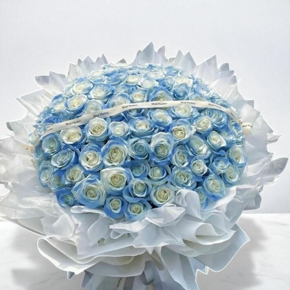 Plongez dans le charme de ce superbe bouquet de notre collection Florists Specials. Avec un extravagant assortiment de 101 magnifiques fleurs bleues, ce bouquet symbolise la foi, la confiance et les émotions profondes. Parfait pour exprimer votre sentiment sincère ou simplement pour ajouter une beauté esthétique à votre espace, il est aussi captivant qu'un océan. Régalez vos sens par l'attrait exceptionnel de ce chef-d'œuvre floral.