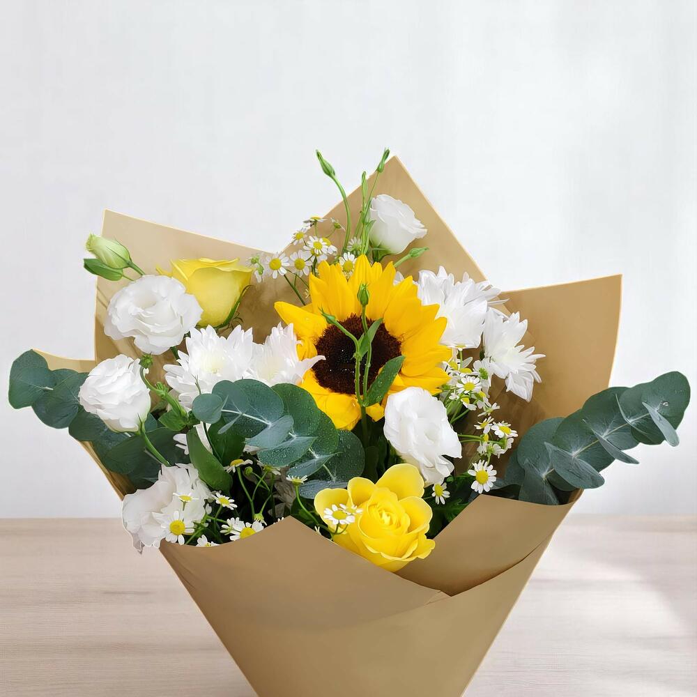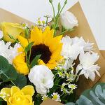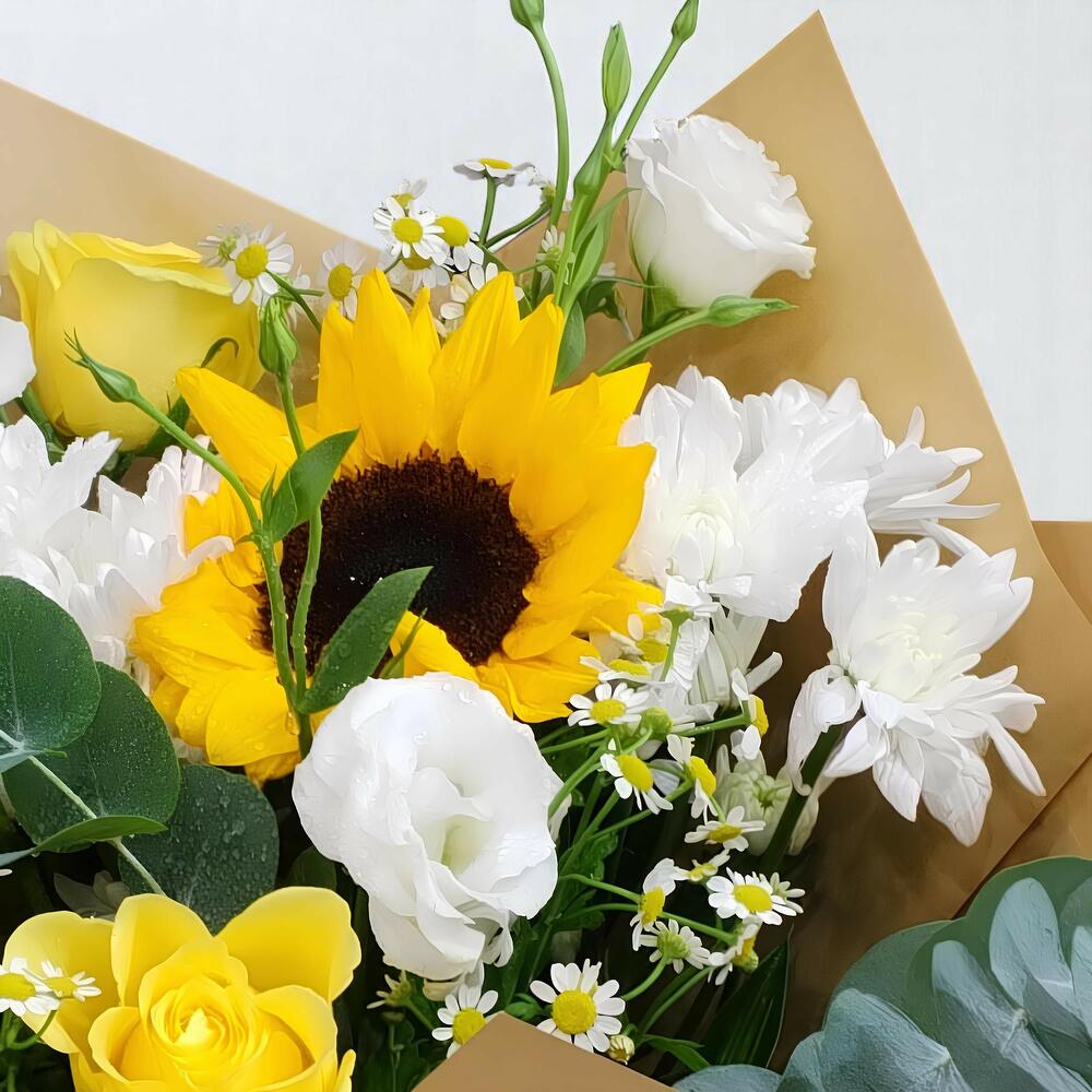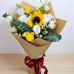Ribbon - 1 pce Sunflower - 1 pce Yellow rose - 2 pce chrysanthemums - 2 pce emballage artisanal - 1 pce eucalyptus leaves - 2 pce estuoma - 2 pce